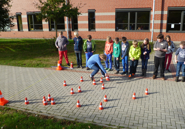 Die so erlernte Formel wurde dann auf das Auto übertragen. Jedes Kind markierte mit einem Hütchen die Stelle, an der es das Anhalten des Autos aus einer vorgegebenen Geschwindigkeit erwartete. Bei diesem Versuch verschätzten sich viele Kinder.