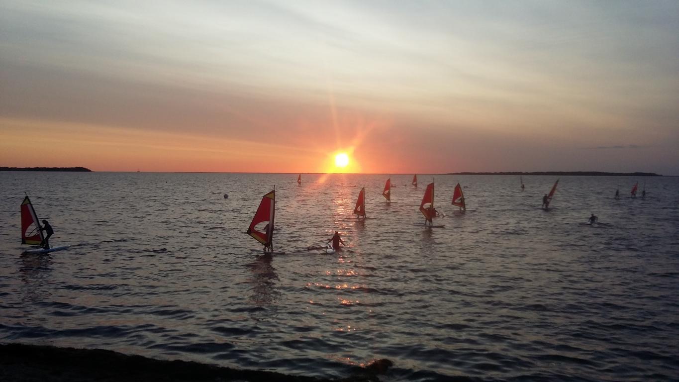 Am Donnerstag war dann die Surfprüfung. Nach der Theorieprüfung gingen wir aufs Wasser und zeigten, was wir in der Woche gelernt hatten: Wir mussten einen Parcour gegen den Wind surfen (= „kreuzen“). Abends ließen wir die Woche in der Disko ausklingen und feierten dort unseren bestandenen Surfschein.