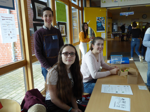 Alle Fachbereiche stellten sich mit viel Engagement vor. So konnten im Fach-bereich Sprachen Vokabeln geklatscht oder im Fachbereich Technik kleine Fahrzeuge gebaut werden. Im naturwissenschaftlichen Bereich wurde auf technisch hohem Niveau mikroskopiert sowie in die Geheimnisse der Physik und Chemie eingeführt. Die Mathematik präsentierte sich u.a. mit vielen kleinen Knobelspielen. Im „Zirkusraum“ unserer AG „Bunte Nasen“ wurden für unsere Besucher kunstvolle kleine Tiere aus Luftballons „geknotet“ und im Kunstraum konnte man grenzenlose Kreativität bei der fantasievollen Gestaltung von marmoriertem Papier beobachten, während man im Fachbereich Sport seine Geschicklichkeit auf die Probe stellen lassen konnte. Rhythmisches Trommeln ließ zuweilen die Aula beben. So wurde musiziert und gesungen, gegessen und gelacht.