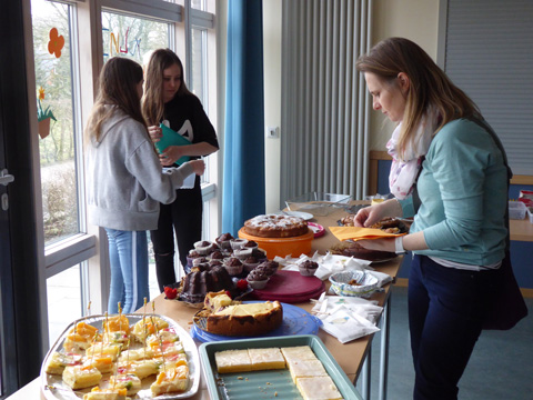 Zahlreiche Kuchenspenden aus der Elternschaft und der tatkräftige Einsatz unserer Schüler und Schülerinnen sorgten dafür, dass nach Schulrallye, Kreativität und gestilltem Forscher- bzw. Bewegungsdrang die „Akkus“ unserer Besucher wieder aufgetankt werden konnten.