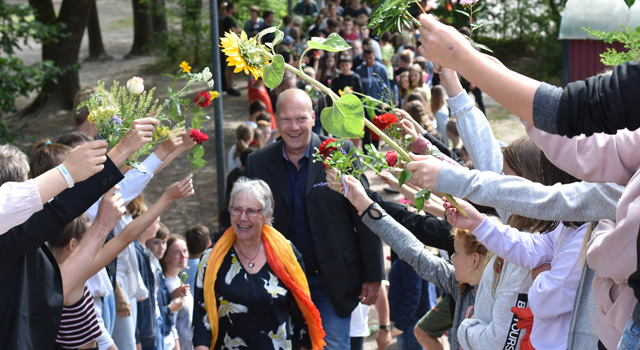 Nach 23 Jahren (!) nahm am vergangenen Freitag unsere didaktische Leiterin, Brigitte Bretschneider, Abschied von Hollenstedt und begab sich damit in den Ruhestand. Die gesamte Schülerschaft bildete für sie ein sich über das Schulgelände erstreckende Spalier und empfing sie mit Trommelmusik in der Aula. Die Schülersprecher bedankten sich im Namen aller Schülerinnen und Schüler für ihren in der Tat stets unermüdlichen Einsatz.